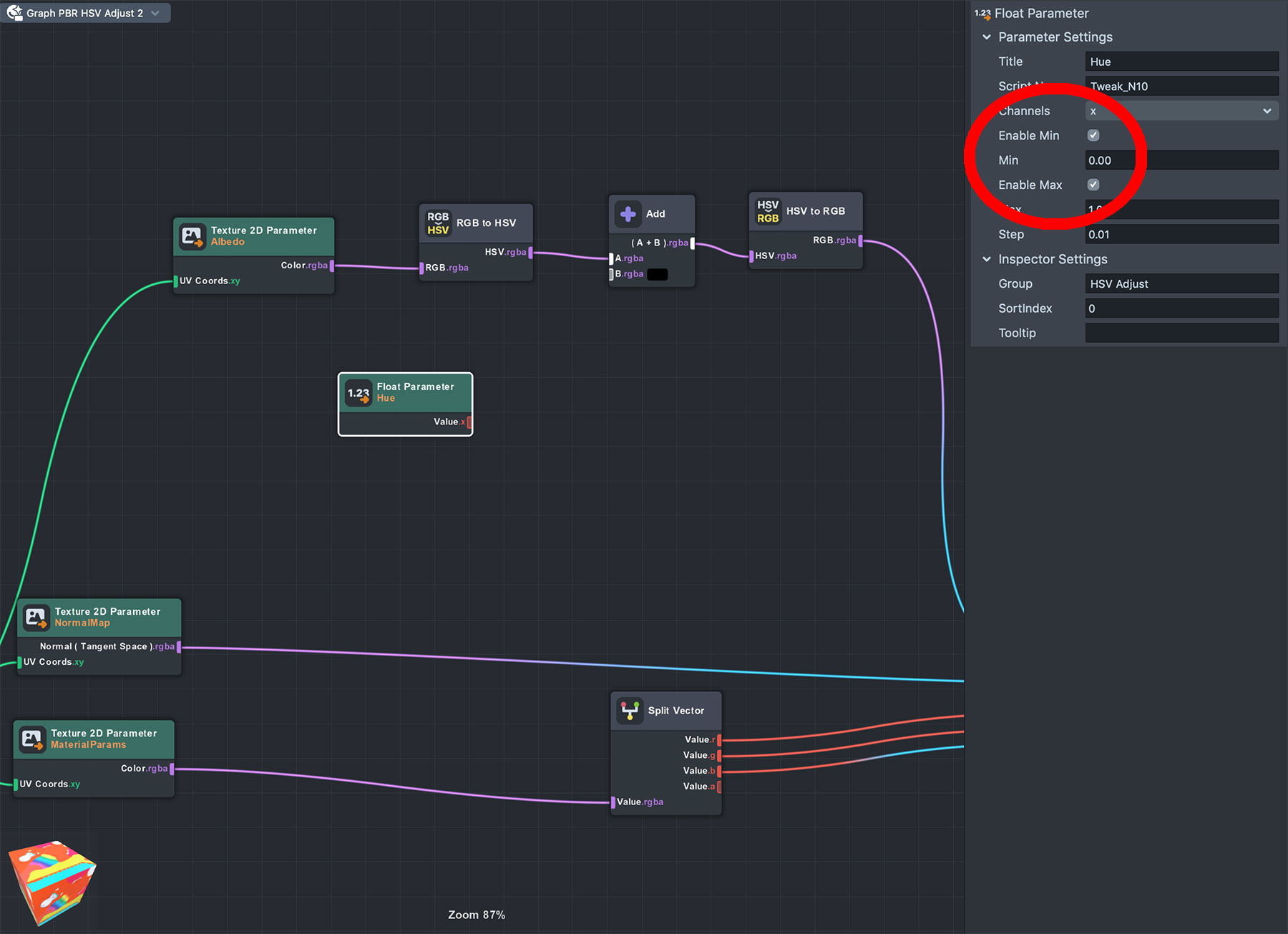 Now we're going to make some controls that we can play with on the material. Add a Parameter (Float) node and name it Hue, and tick Enable Min and Enable Max in the Parameter Settings window. This will turn our parameter into a slider.