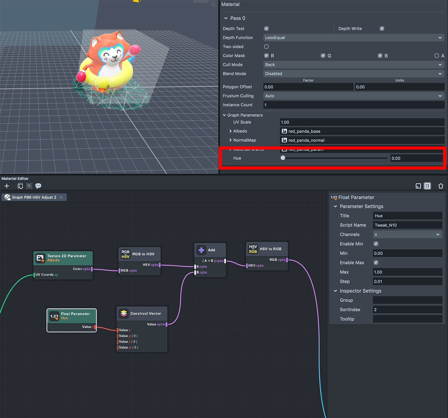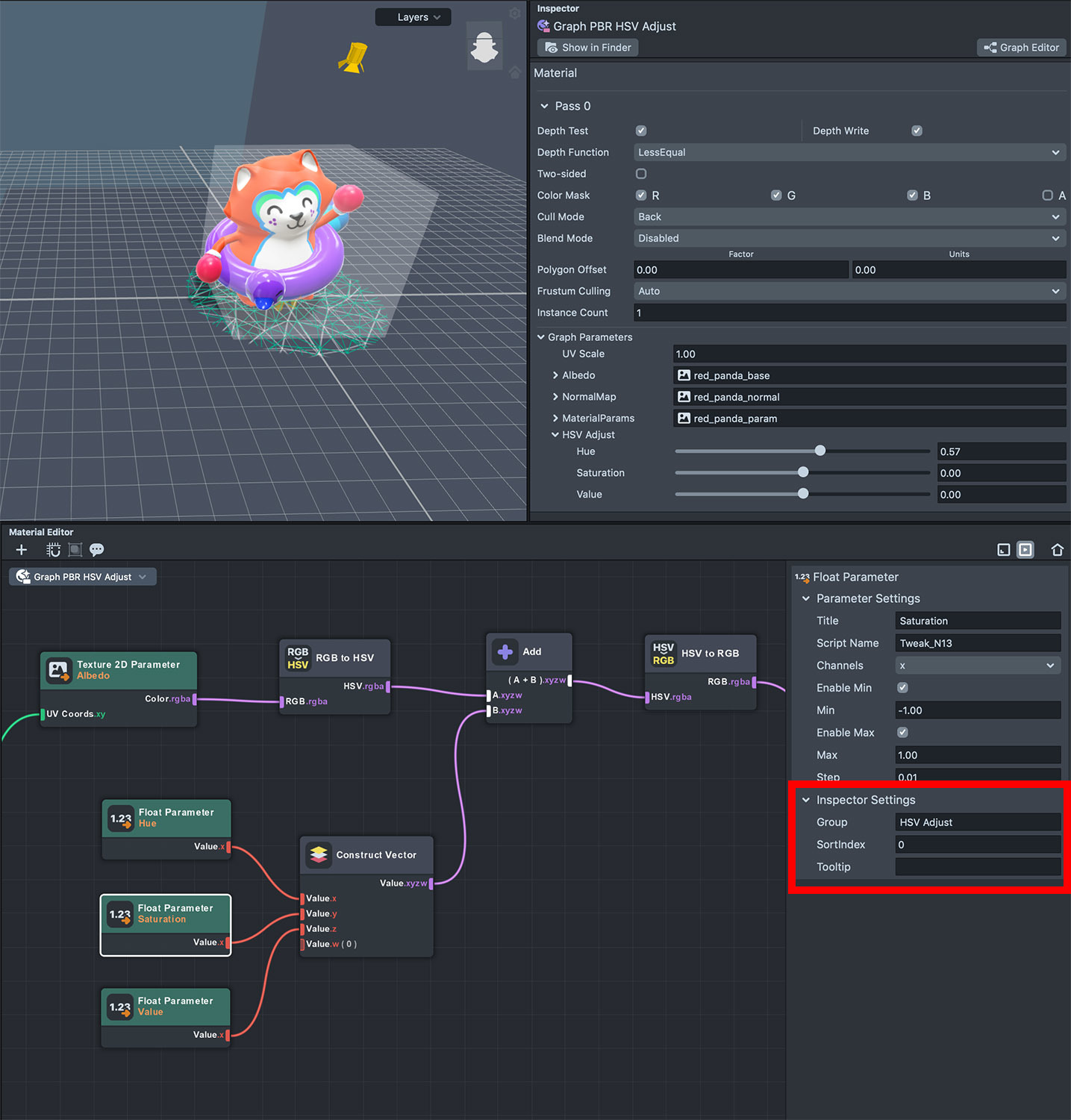 Now you should have your new Hue, Saturation, and Value parameters collected into a group called HSV Adjust on your material. Congrats!