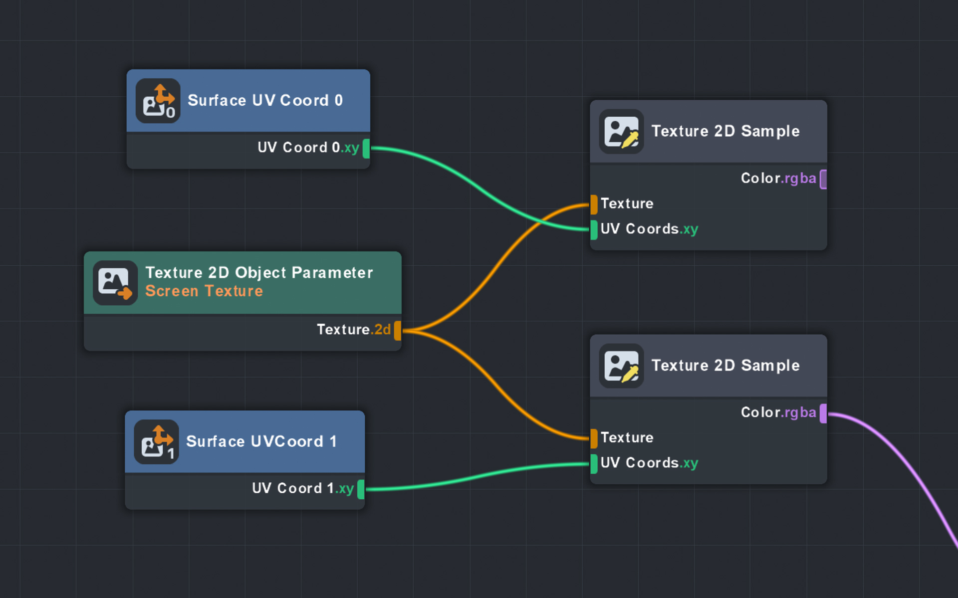 Create a Screen Texture node and connect it with a Sample Texture. Hook up our new UV to its UV Coords.xy input, and then feed the result to a Shader 3D at the end.