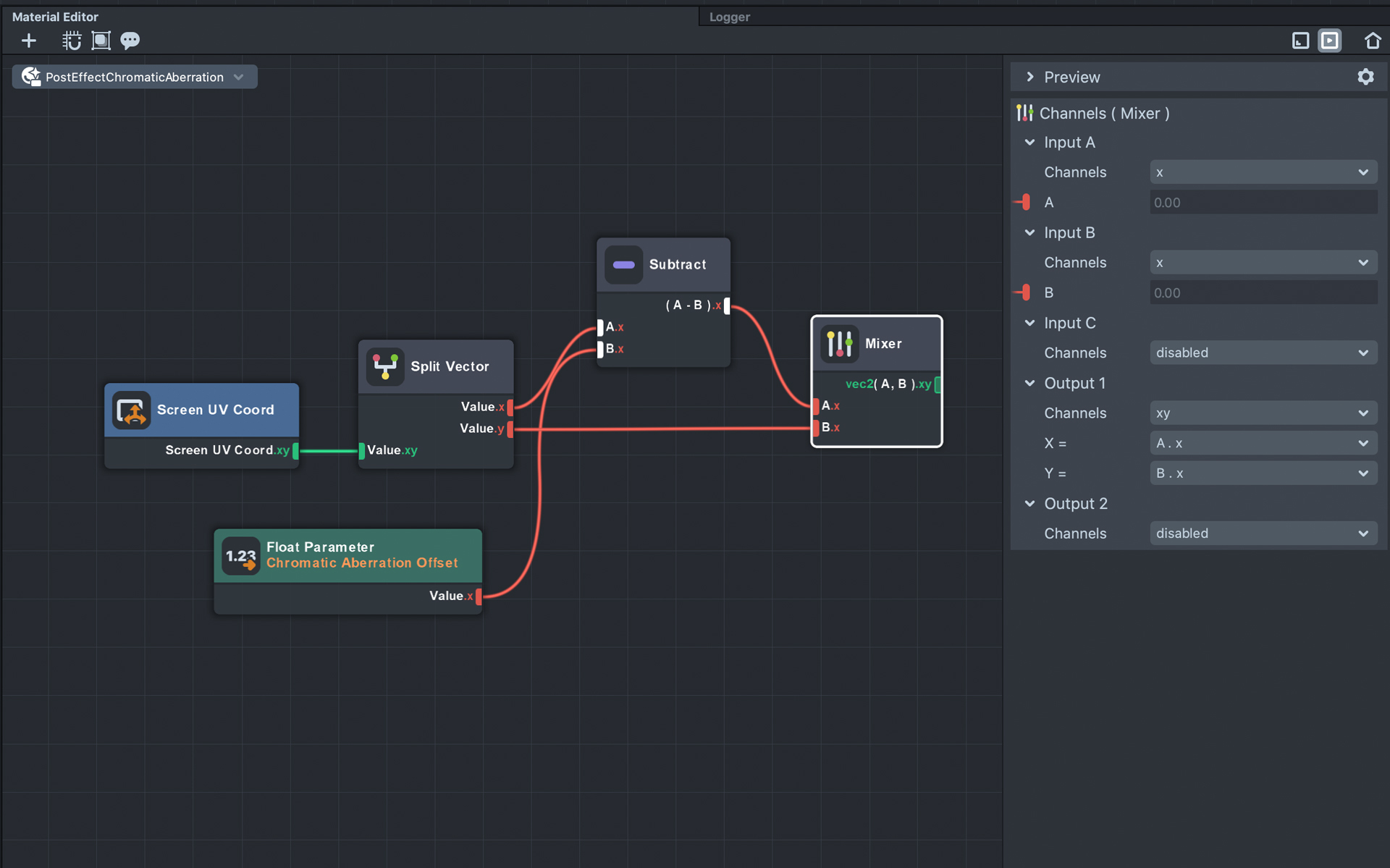 To offset the image horizontally, let's work on one side first by using a Subtract node to subtract the “Chromatic Aberration Offset” from Screen UV Coord.x. Combine this result back with original Screen UV Coord.y with a Channels (Mixer) node, and you get a new UV coordinate: