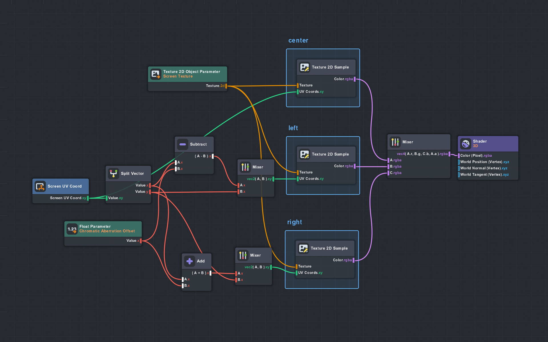 Let's give Screen UV Coord its Screen Texture by connecting them straight to a new Texture Sample and call it "Center". We have Center, Left and Right split by chromatic aberration offset. Create a Channels (Mixer) node again to read in RGBA but only output R channel from the Center texture. Same for the G channel from Left and B channel from Right. Create one final Mixer node to connect all three texture sample outputs. On the Mixer node, you can expand how many inputs are accepted by the Channels dropdown menu. Finally connect this result to a Shader 3D node and we are done: