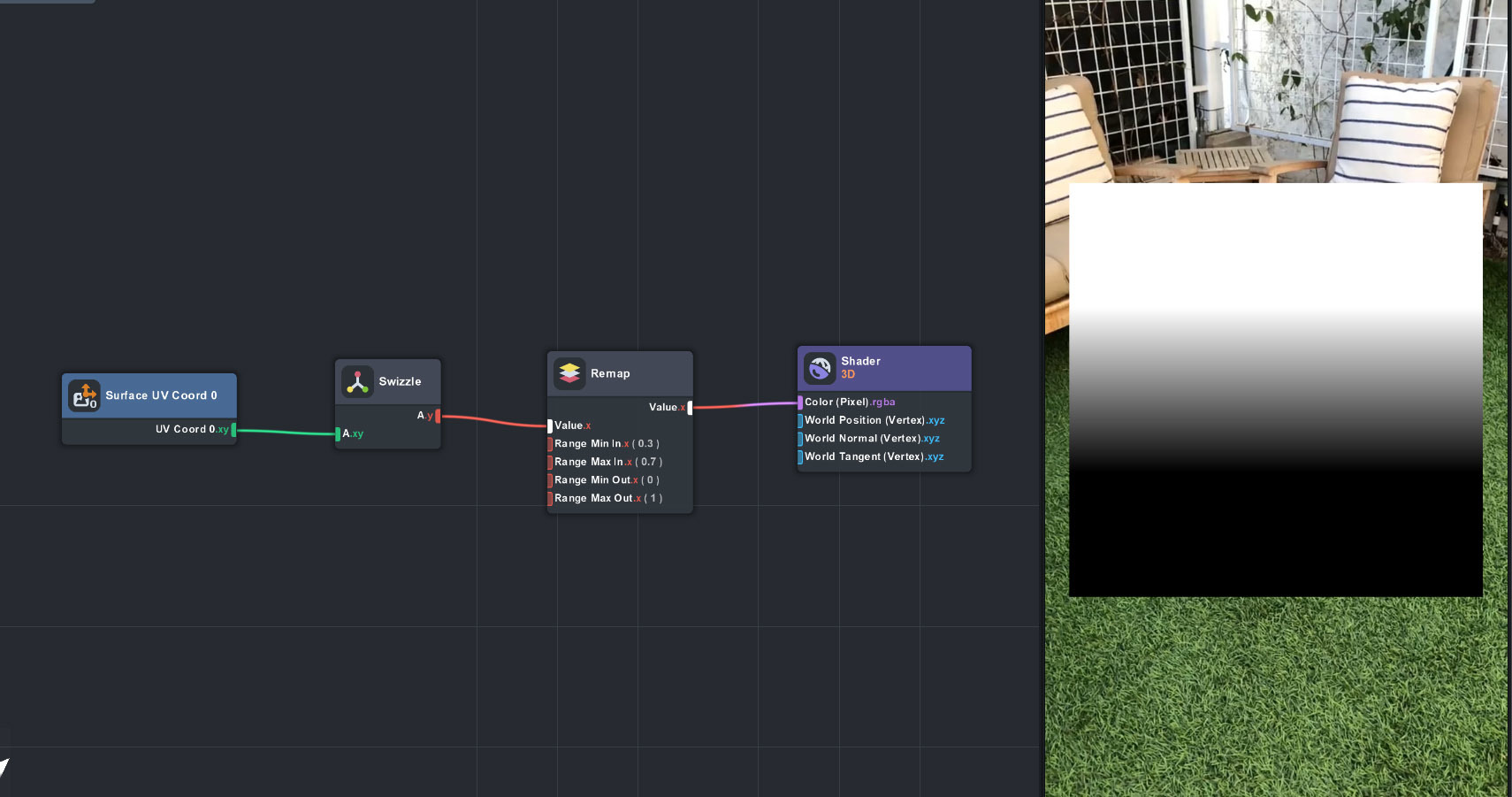 Next, we plug that into a Remap node, and the Remap output into the Color (Pixel) input of the Shader (3D) node. If you're using a Plane mesh, you should see a black and white vertical gradient. Play with the Range Min In and Range Max In parameters on the Remap node to compress the range of the gradient. In the picture below, I set Range Min In to 0.3 and Range Max In to 0.7<code>.