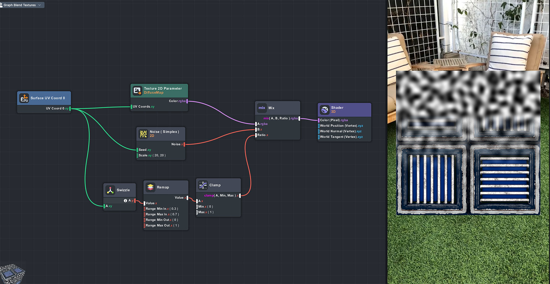 In this guide, we'll look at using UV coordinates to control blending between two textures. We'll use Swizzle, Remap, and Mix to achieve the effect.
