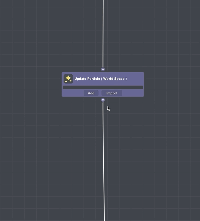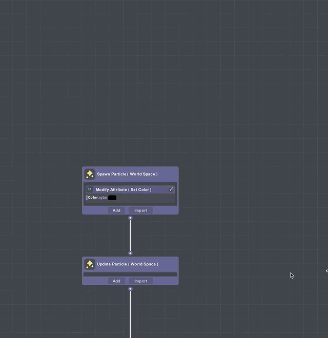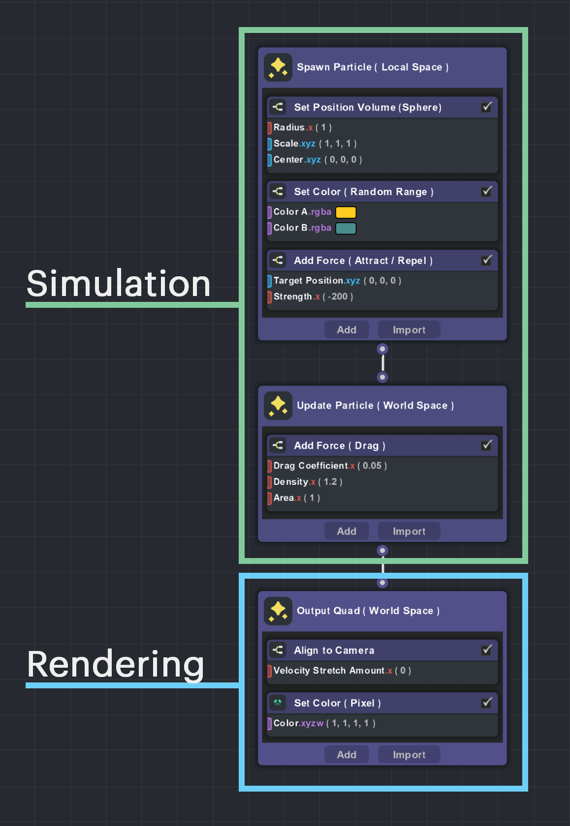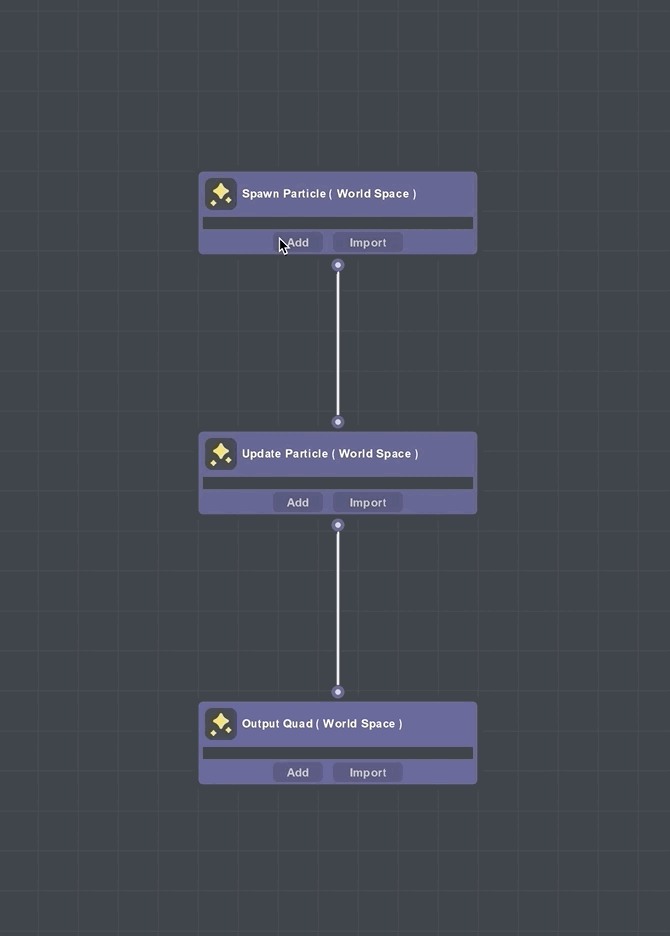 The first two stages, Spawn and Update, can be thought of as, collectively, the simulation part of VFX Editor. This is where particle movement and dynamics are defined. In the Spawn stage, initial values are set on the particle the moment it is created. The Update stage is processed every frame the particle is alive. These stages do not render anything to the screen.