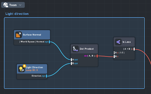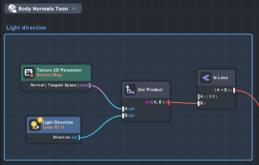 This material uses the normal direction and the light direction to find which areas should be “flat” and which areas should be “shadowed”. It expects to be applied to a mesh with a calculated Surface Normal direction: