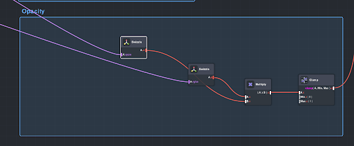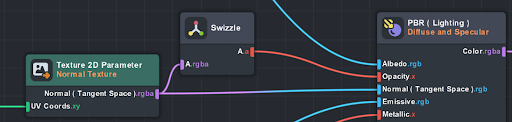 Lastly, to have them be displayed in our material, connect these nodes to the albedo and opacity port of the PBR node: