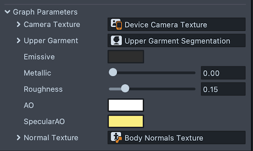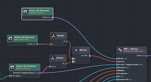 Start with the simple PBR material referenced earlier. Next, we can add Texture 2D Parameter nodes to pass in texture to our material. Add a node for the camera texture so we can set the albedo of the material. Similarly, add a node for the Upper Garment Segmentation texture to decide where to apply this material.