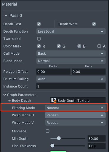 When using the Body Depth Texture in materials, always select the Nearest Filtering Mode. If you don't, your material won't work on some Android devices due to a lack of support: