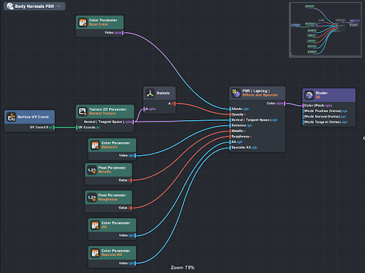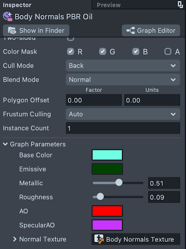 To ensure that you only visualize the material when the normal information is valid, map the alpha channel of the Body Normals Texture to the opacity channel of the PBR material: