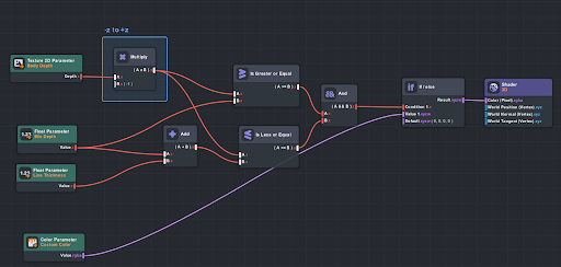 Starting from the previous depth visualization material, add a color input parameter and replace the remap with an explicit check to see if the depth is within the provided range: