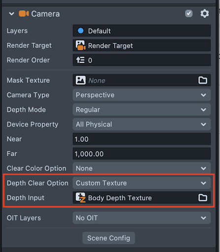 In this camera’s properties, set Depth Clear Option to Custom Texture. Choose the Body Depth Texture as the Custom Texture input: