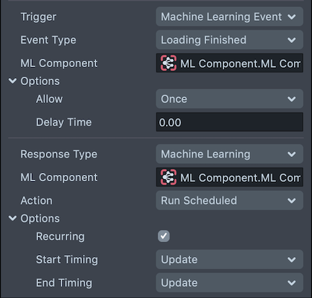 The Auto Run checkbox is on the ML Component is equivalent to:runScheduled(true, MachineLearning.FrameTiming.OnRender, MachineLearning.FrameTiming.OnRender)