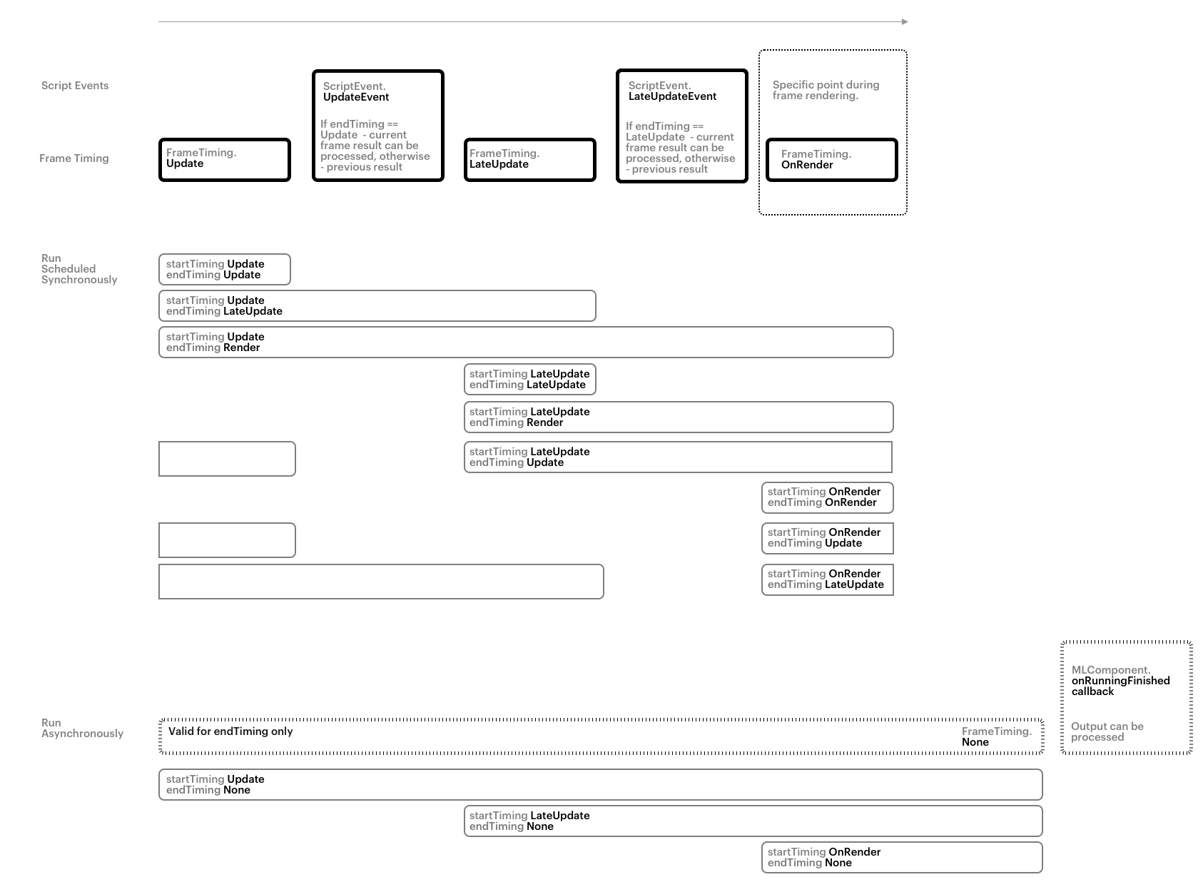 MachineLearning.FrameTiming.OnRender: start or/and end running at a specific point during frame rendering. This is the best option when taking an input texture that has to be prepared that frame, and giving an output texture that should also be used that frame.