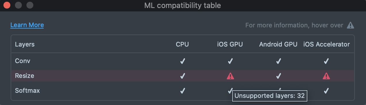 In the upper left corner of this prompt you will see a compatibility table of Ops in your model and different available inference frameworks. These are used to accelerate model inference if the device that’s running your lens has the ability to utilize these frameworks and if all of the Ops are implemented in a given inference framework. If your model has unsupported Ops, you can hover over the warning icon and it will provide you with a layer name that has this issue.