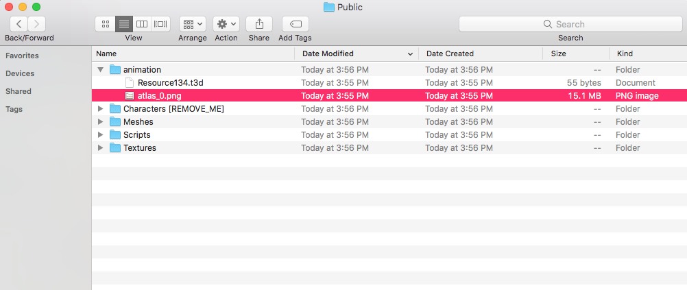The fastest way to do an optimization pass is to first open your project's Public folder, where you have direct access to all of the assets in your project. You can find the Public folder wherever you saved your project and then make changes to the textures directly inside the folder.