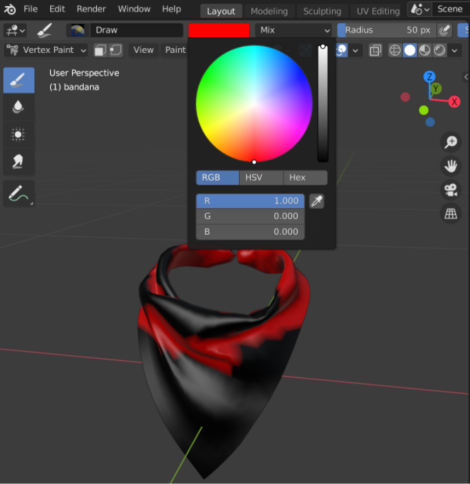 With different vertex colors, you can bind vertices to Pivot Points in Lens Studio. The bind parts won’t be affected by cloth simulation, but are stationary relative to Pivot Points. For example, you can bind the red part of the mesh bandana to the Neck Pivot Point object. Thus, the red part of the bandana remains relatively static to the Neck and the black part will have the cloth simulation effect.