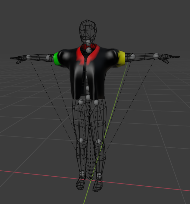 With the bindPoints FBX, you have a reference for the cloth binding points. They are the spheres in the screenshot. Combining bind points and 3D body tracking, you can then bind different cloth vertices to the body tracking points. For example, with the jacket, you can bind the green part to the right arm bind point, the yellow part to the left arm bind point, and the red part to the neck.