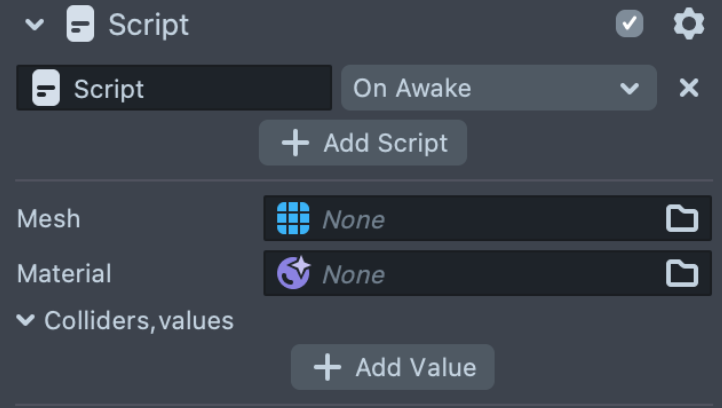 Add a new scene object in the Objects Panel and rename it to “Cloth Simulation” (Objects panel > + > Empty Object). In the Inspector Panel, add the Cloth Simulation script to the object as a new Script Component. (Inspector panel > + Add Script > Cloth Simulation). Now you can attach your own mesh, material, and colliders.