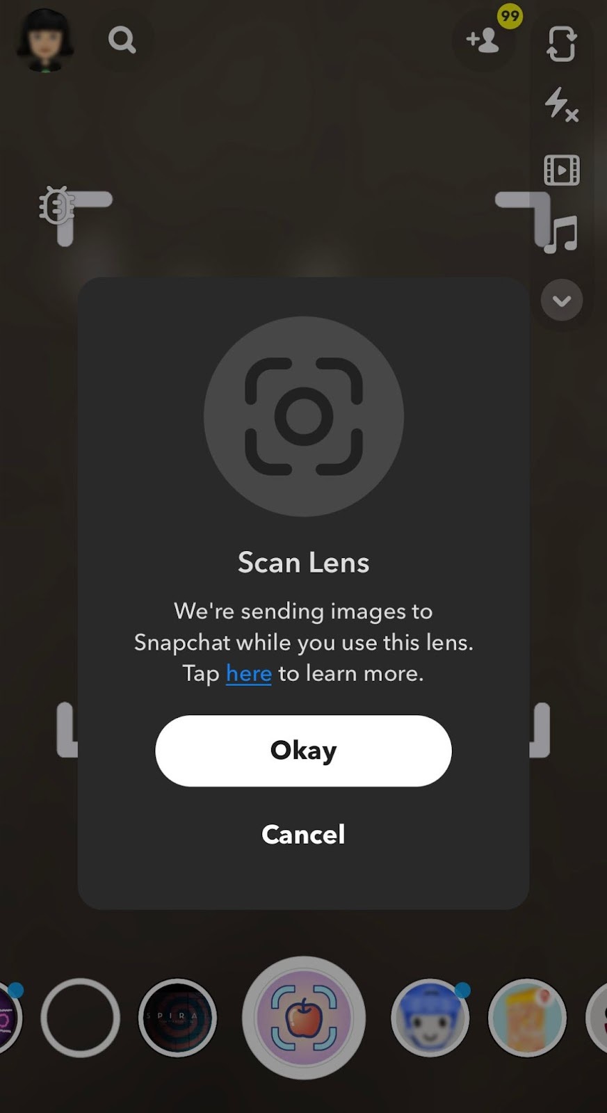 When the user presses Okay, this screen will disappear and your Lens experience will continue. If they press Cancel, the lens will be loaded but none of the functionality involving scan would work because there will be no data returned.