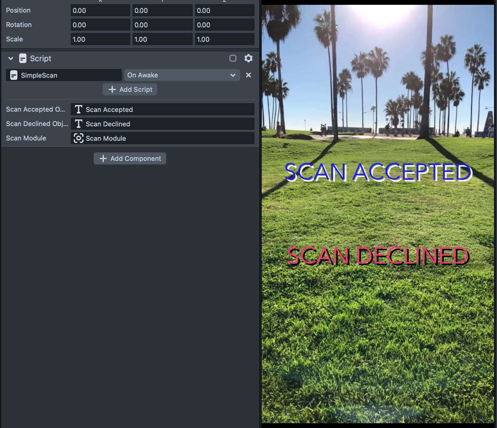As an example, we can create 2 simple screens in Lens Studio, one will pop up when scan permission is accepted and another will pop up when permission is declined. We can add 2 references to the scan script we created earlier. We can input any objects into these 2 fields, for this demo we'll create 2 Screen Text objects, but feel free to use any custom design for official lenses!