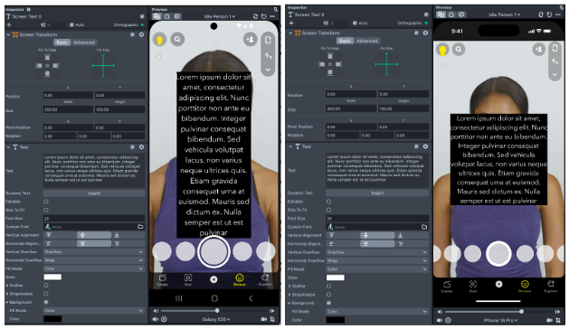 However, you should note that since screens might have different aspect ratios, or overall size, text might flow differently. In addition, the Screen Transform settings will still apply as usual. So, as always, you should check your Lens with different devices in the Preview panel.