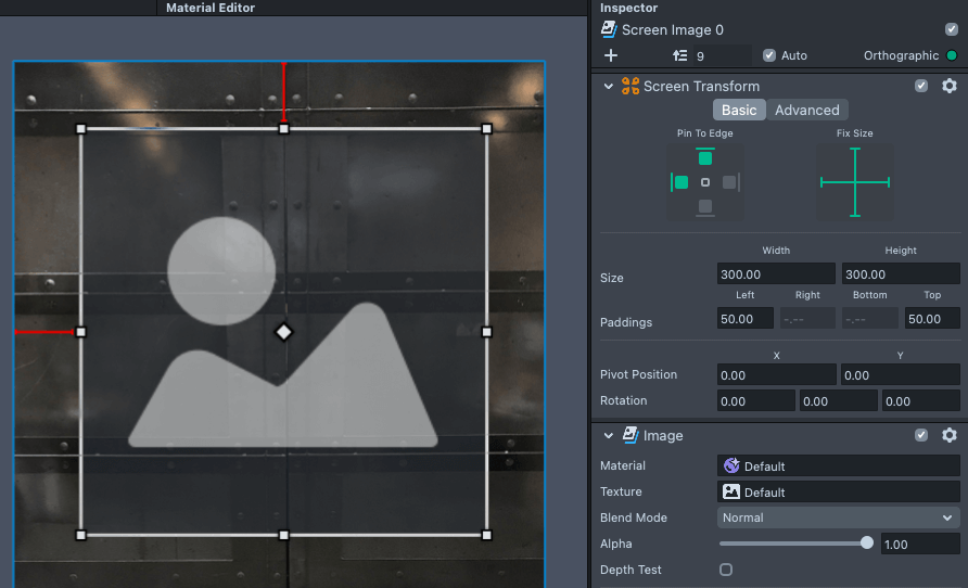With the newly added image selected, in the Inspector panel, you can configure its Screen Transform to use a Fixed Size, and notice that we’re no longer sizing based on the normalized of the screen (0-1) but rather absolute value (what we chose earlier).