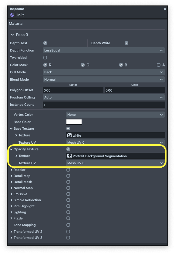 Segmentation textures can be tuned by selecting them in the Resources panel and tuning its settings in the Inspector panel.