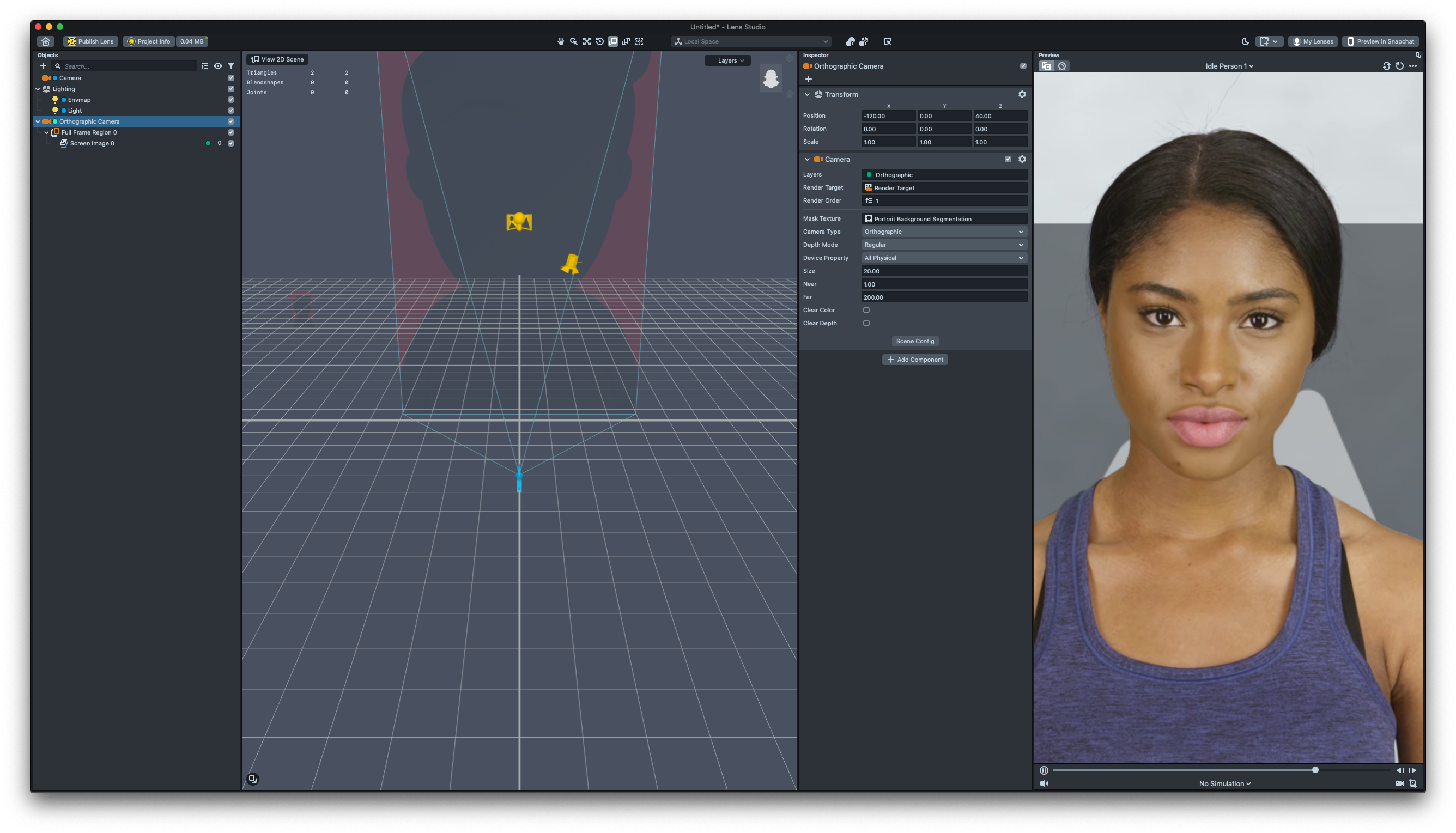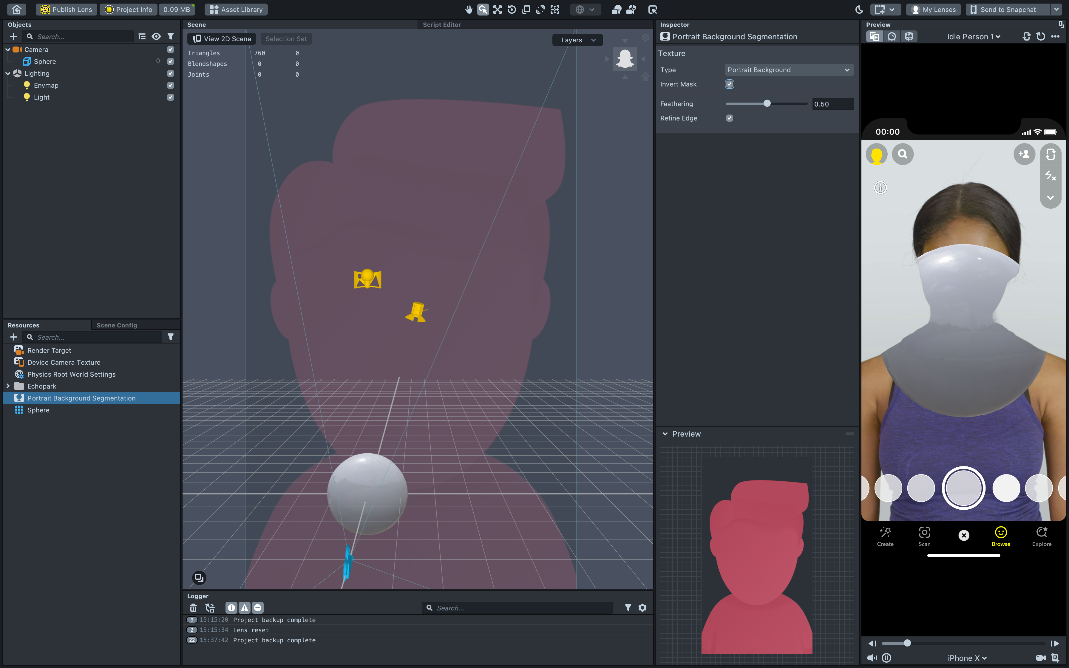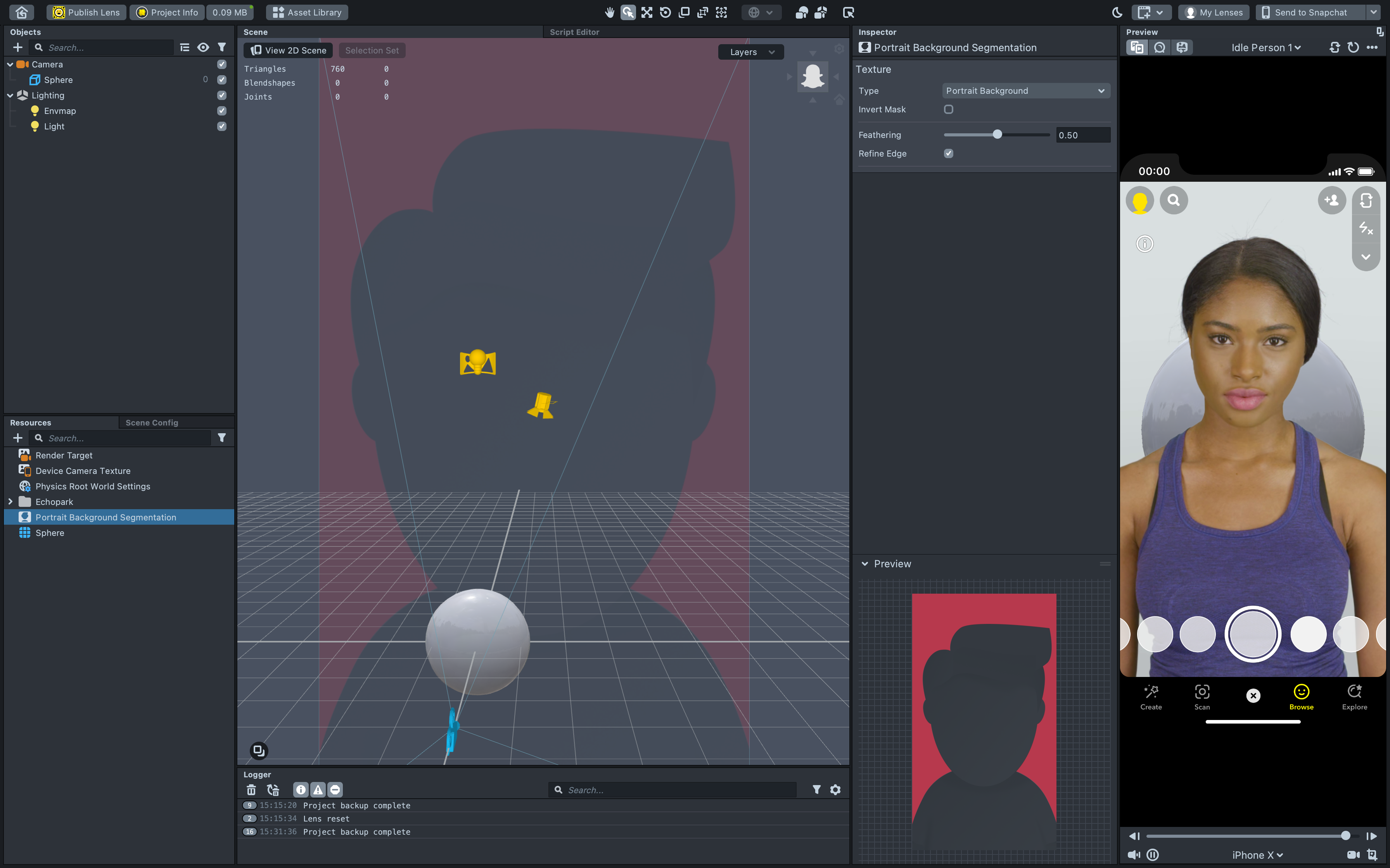 Segmentation Textures are masks that are updated in real time based on what is seen in the device's camera. Segmentation textures can be applied to a camera's Mask Texture input to show or hide certain areas of the scene. For example, the Portrait Background Segmentation texture creates a masked image of the portrait of the user. This mask texture can then be used as an input to a camera to only show elements behind the user. It's like a green screen without the green.
