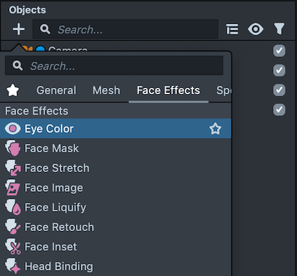 To create an Eye Color object, first click the "+" button in the Objects panel. Then, select Face Effects -> Eye Color.