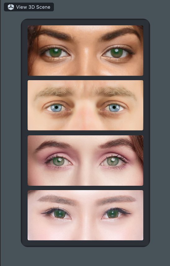 The Eye Color object is a 2D object. Adding a new Eye Color automatically opens the 2D Scene View to visualize the effects.