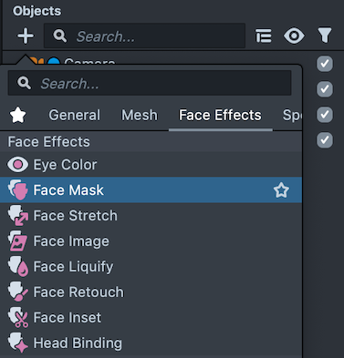 To create a Face Mask object, first click the + button in the Objects panel. Then, select Face Effects -> Face Mask.