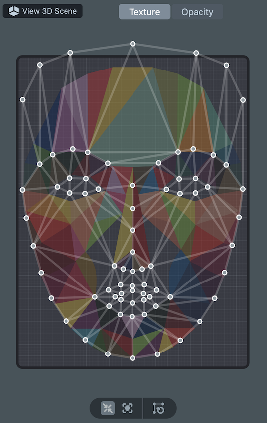 The Opacity Texture has a different set of anchor points. To tune the Opacity Texture points, choose Opacity from the toggle above the point editor. Align your anchor points to fit the Opacity Texture. Note, every Face Mask has a default Opacity Texture so you can ignore this step if you don't need a custom Opacity Texture.