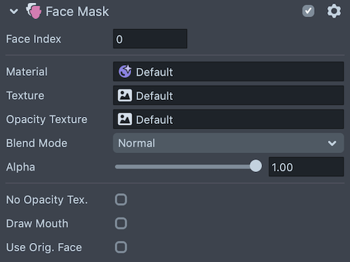 Face Maskwill draw. White in the Opacity Texture defines areas where the face texture will be drawn while black occludes. TheFace Maskobject initializes with a default Opacity Texture - Blend Mode -
