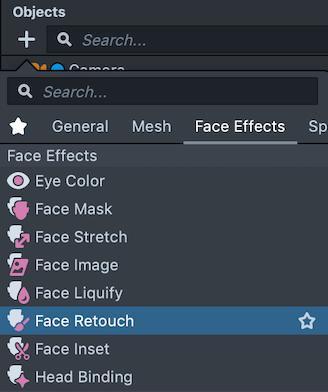 To create a ML Retouch effect, first click the "+" button in the Objects panel. Then, select Face Effects -> ML Retouch.