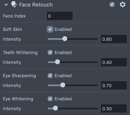 Once added, you should see a new ML Retouch object in your Objects panel. Select it to configure the ML Retouch features in the Inspector panel. Each Retouch feature has an Enabled boolean, which when checked enables the effect. Additionally, each ML Retouch feature has an Intensity slider, which determines how intense the effect is when applied to the face. Try to use low intensities to produce a more subtle effect.
