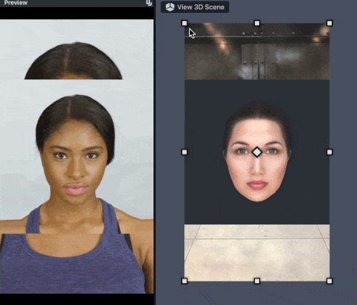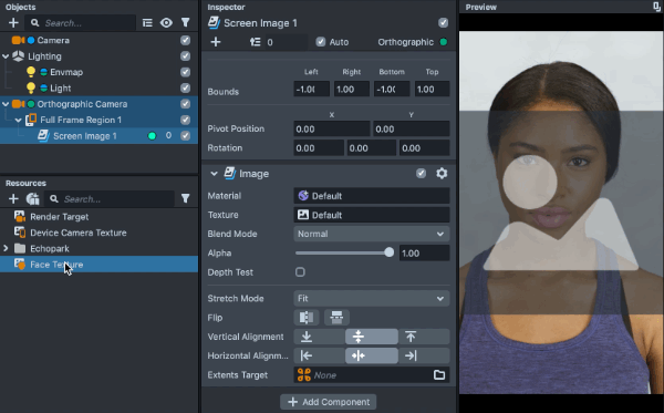 The Face Texture resource allows you to get a your Camera texture centered around a part of your face. It can be used, for example, for creating a picture in picture effect, or for applying a user’s face to a 3D object in your Lens.