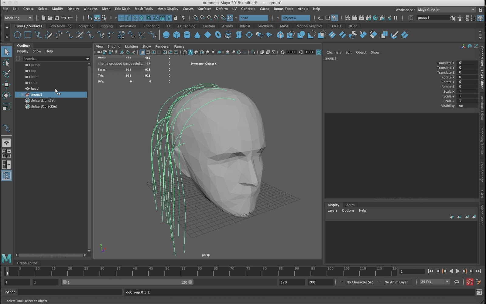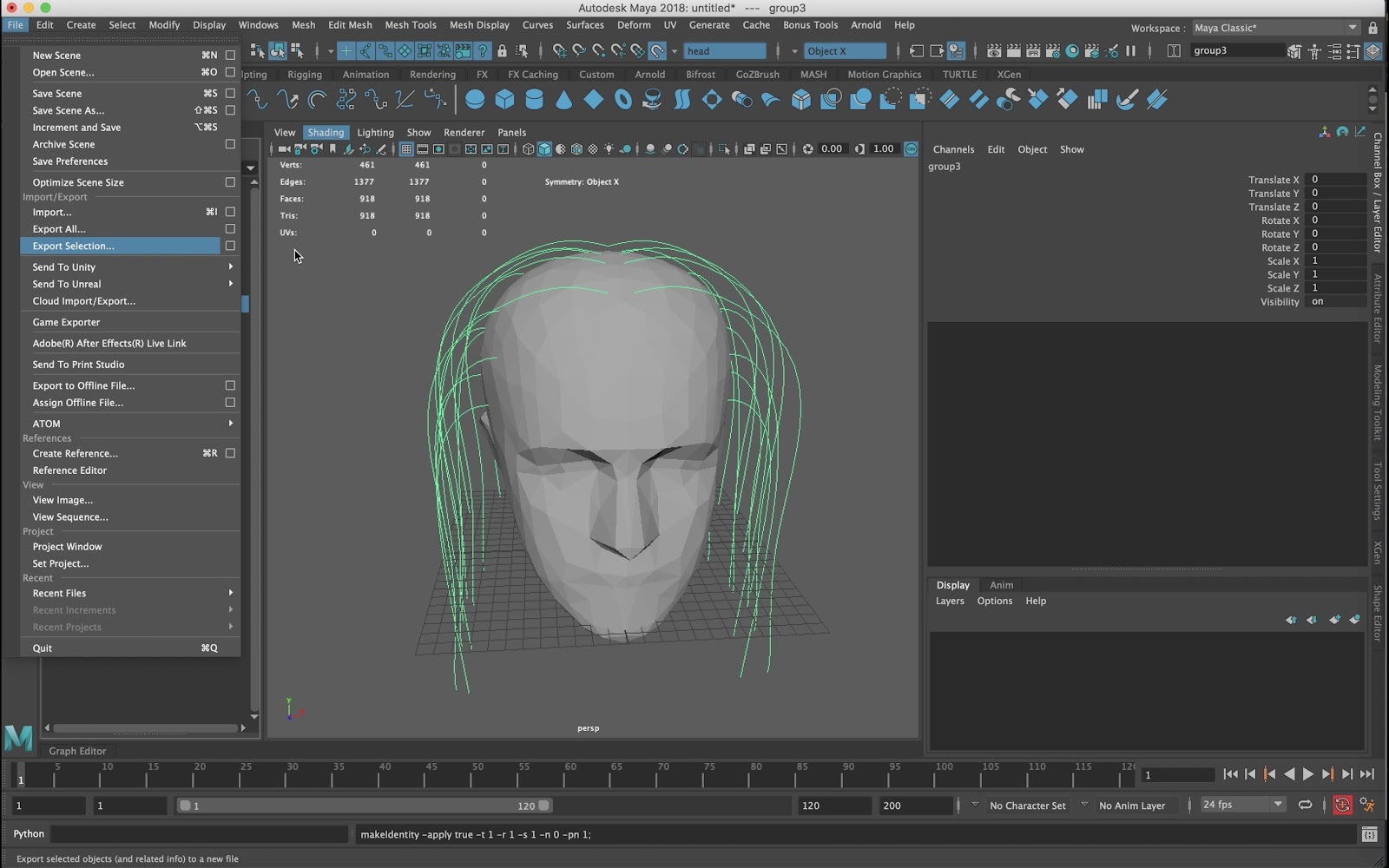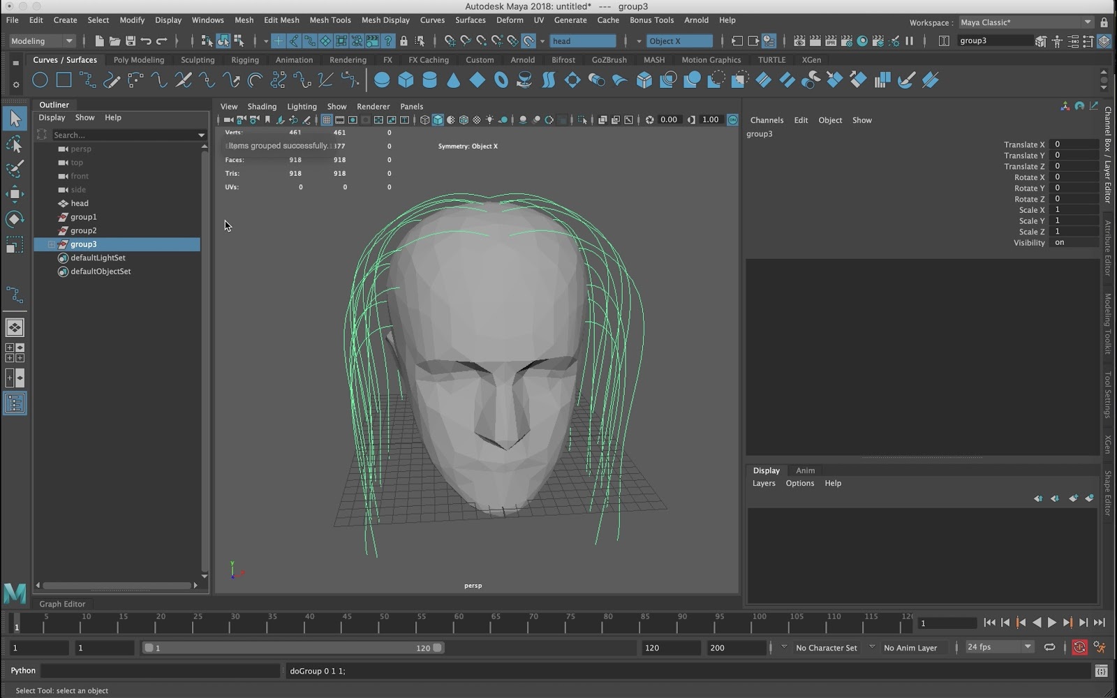 Once hair guides are grouped repeat step 2 so that group pivot is also at 0,0,0. Now you’re ready to export to FBX !