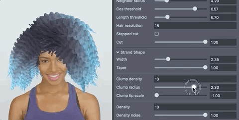 The Clump section defines how ‘messy’ the hair looks. Increasing Clump radius will affect the distance of each strand between each other. Clump density affects how much more strands are generated to increase the volume of the hair. Clump tip scale determines the amount of separation between hair tips.