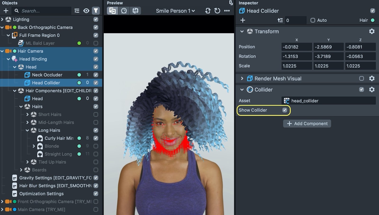 The properties under the Collision panel affects how the hair object collides with external colliders, and properties under the Self Collisionpanel affect how hair collides with each other. Colliders can be added with the Add collider button. In this case the collider is set to be the Head Collider object under Head Binding > Head. Turn on the Show Collider check on this object to see the shape of the collider!