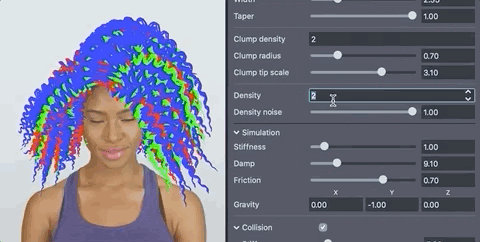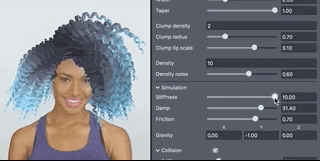 The Simulation section sets up properties related to hair’s physics simulation. Stiffness will determine how stiff hair is. Damp will determine how ‘sticky / flowy’ hair seems. Friction will determine the amount of friction between each hair strand.