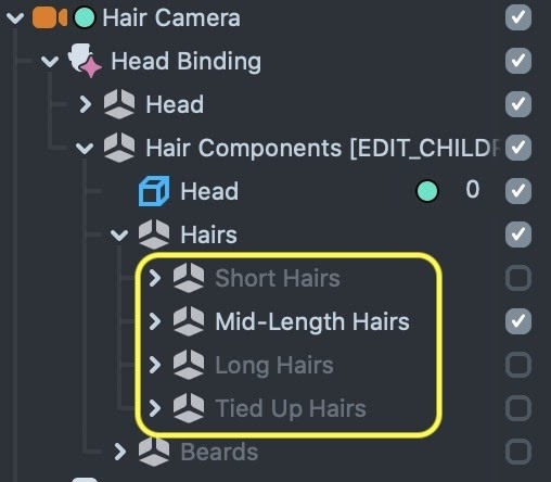 Under the Back Orthographic Camerain the Hair Template, we have the Hair Camera. Under this camera we have everything related to simulating hair. To check out different hairstyles, try toggling objects under Head Binding > Hair Components