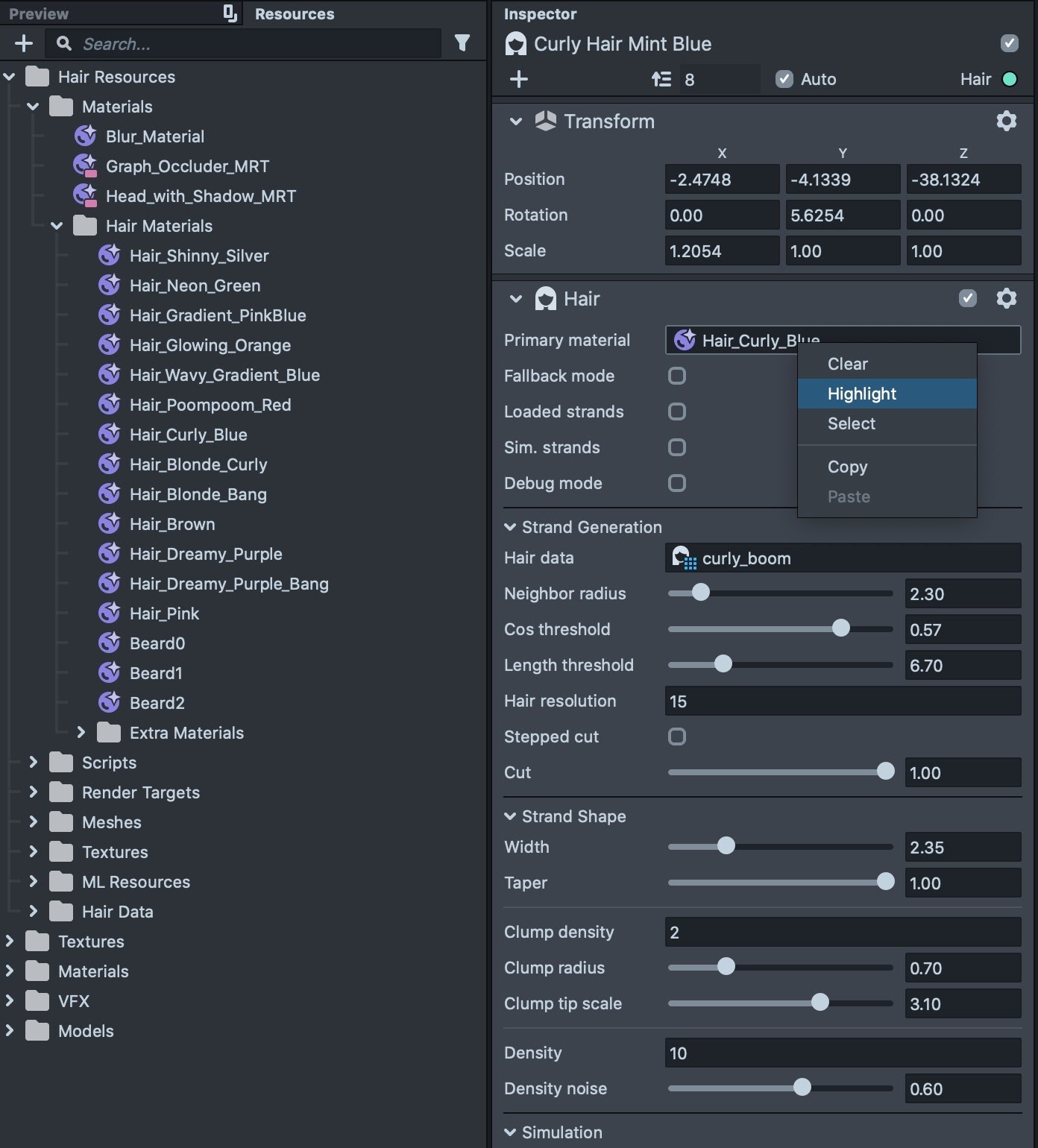 All hairs use a special material with special settings for hair. You can also create this material from scratch by going to Resources > + > Hairstyle Materials