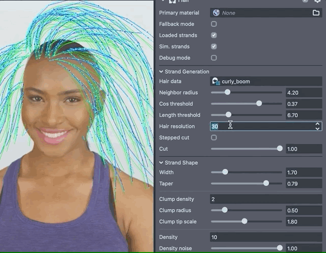 The deep blue color represents the original strands of the hair, light blue represents simulated strands which will be changed by changing Hair Resolution. The green strand represents a smoothed result of the light blue strands.