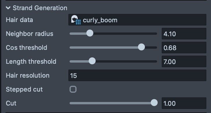 Neighbor radius is the threshold for generating simulated strands based on distance between strand neighbors. Cos threshold is the cosine angular threshold for generating simulated strands. Length threshold is threshold for strand length to generate simulated strands.