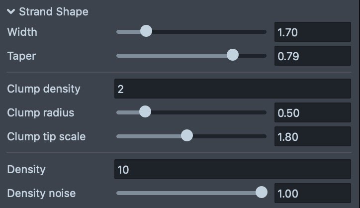 The Strand Shape section has parameters that affect the shape of each hair strand. Changing Width will change how wide each strand is and Taperwill affect the tip size of each strand.