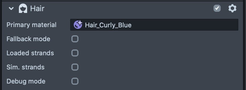 The first section on the Hair Component has the hair material as well as several modes for viewing and understanding the hair simulation.