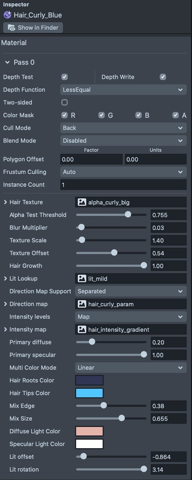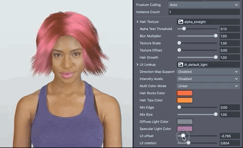 The Lit Lookup map uses a texture’s RGB value to adjust the brightness and shininess of the hairstyle. Feel free to swap current texture with any of the presets to see how it affects the hair differently.