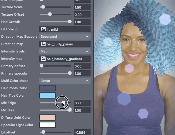 The Hair Roots Color and Hair Tips Color determines the main color tone of the hair. You can adjust how they mix in with each other by adjusting the Mix Edge and Mix Size parameters.