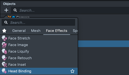 A 3D object is attached to the face using a Head Binding object. To create a Head Binding, in your Objects panel select: + -> Face Effects -> Head Binding.