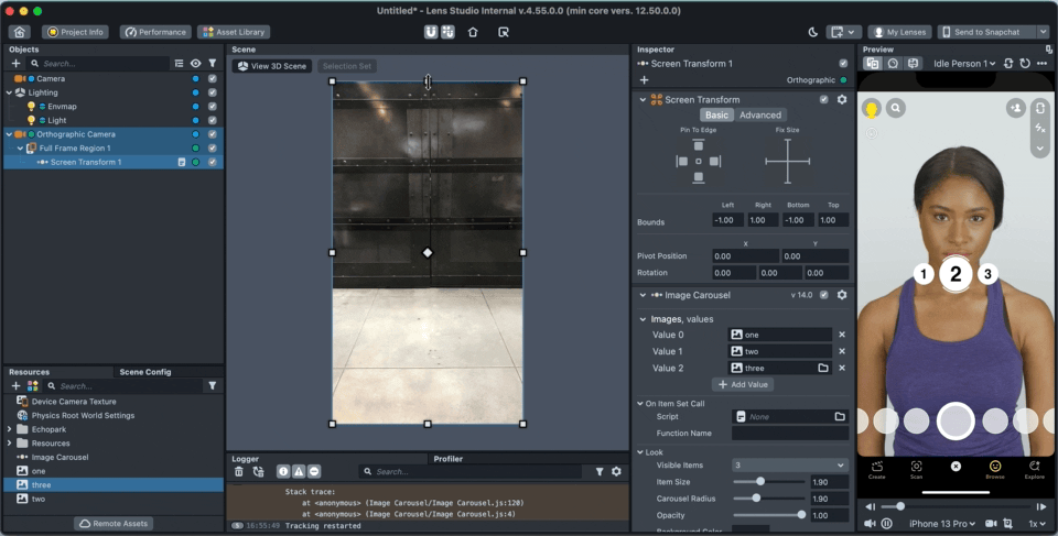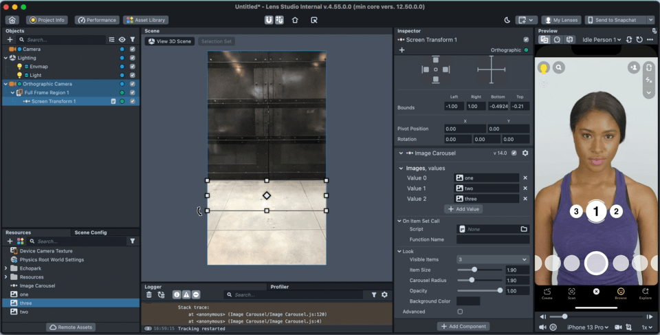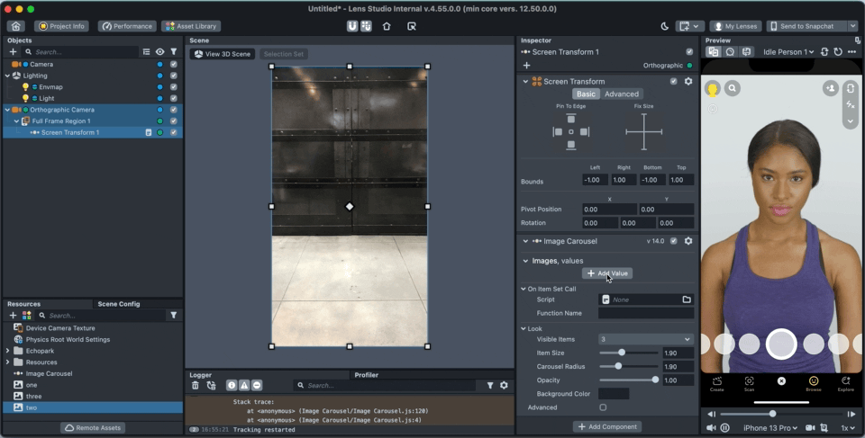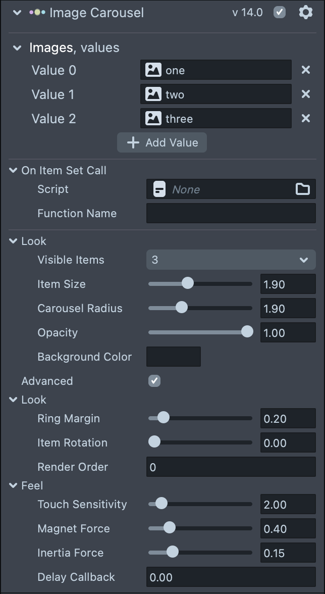 Items are added to the carousel by adding to the "Images" input array. Click on “Add Value” and select or drag a texture to the newly created field. (Items can be also added through a script using the API, see Full API section below)